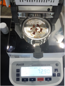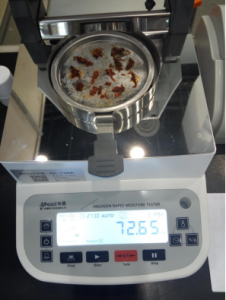 用鑷子提取2.2克牛肉肉末,置于不銹鋼托盤中,用鑷子將牛肉肉末平鋪均勻,溫度設(shè)置145℃用儀器進行加熱,檢測結(jié)束,檢測數(shù)據(jù)顯示71.16%;為了檢測儀器的精確性,待儀器溫度降至50℃以下時進行第二次測量,用實驗勺提取2.2克牛肉,置于不銹鋼托盤中,用實驗勺將面粉平鋪均勻,溫度設(shè)置150℃用儀器進行加熱,檢測結(jié)束,檢測數(shù)據(jù)顯示71.85%;